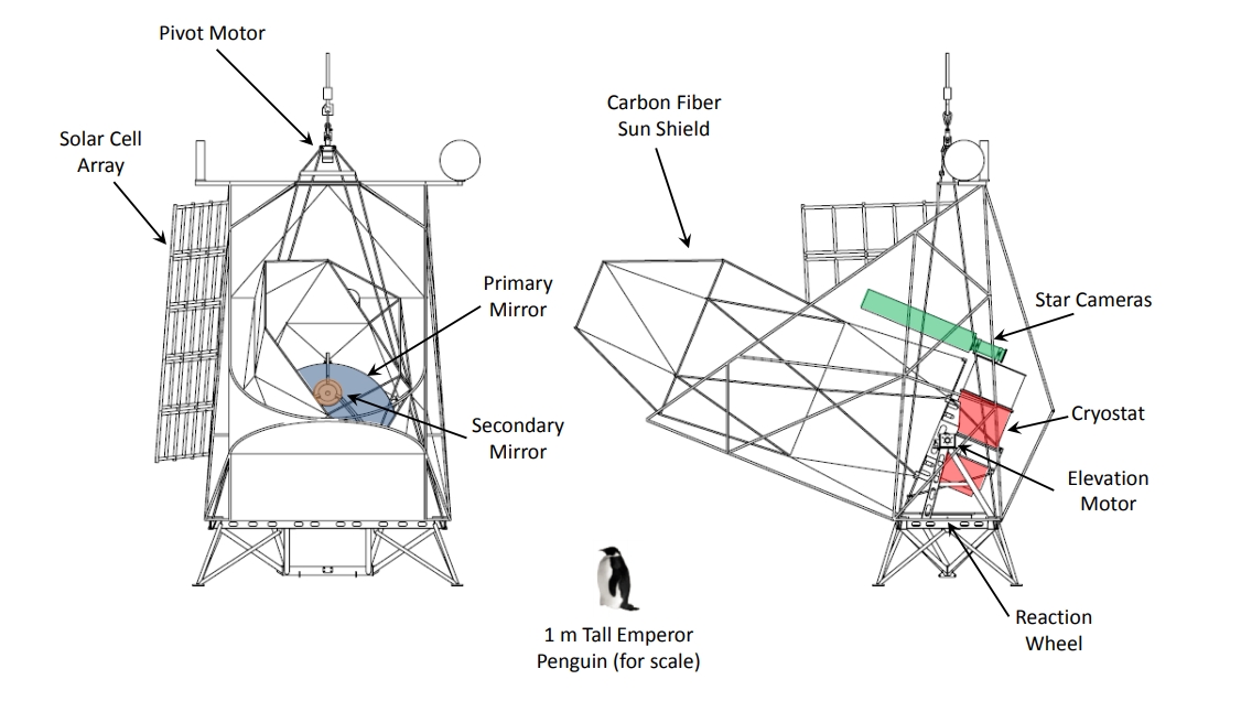 BLAST-TNG stands for Balloon-borne Large Aperture Sub-millimeter Telescope - The Next Generation. It's a new telescope designed to observe the polarized thermal emission from interstellar dust. The data it collects will provide new insight into the properties of dust and the role of magnetic fields in the interstellar medium through a wide range of densities. It continues the legacy of BLASTPol another instrument flown on a long-duration stratospheric balloon flight in Antarctica. At left we can see an scheme of the instrument (click to enlarge).