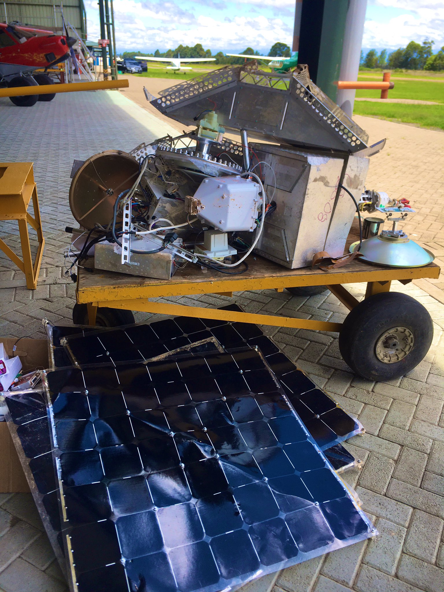 All these elements were mounted on a tubular aluminum and styrofoam structure. Attached solar panels powered the entire system during the day, while charging lithium batteries that powered the systems at night. The entire structure was attached to the balloon by means of a rigid aluminum pipe that ensured that both elements remained together during the descent. The total mass varied between 30 and 50 kg. Although the balloons flew well above commercial aviation, they had several safety measures to rule out any possibility of collision: the entire structure was covered by radar reflective material, in each corner of the solar panels there was an omnidirectional white strobe light with a range of 5 nautical miles that flashed once per second, and a transponder constantly transmitting the position and altitude of the balloon to air traffic control and other nearby aircraft.