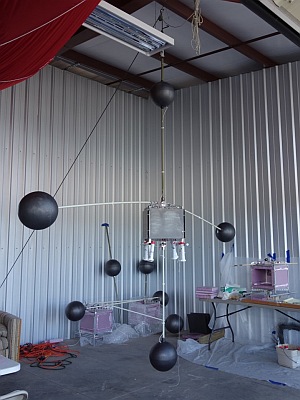 At left we can see an image of one of the payloads (click to enlarge). It is composed by a cubic styrofoam box that holds all the flight electronics except probes and antennas. It is sealed, in order to keep the batteries as warm as possible. From this structure extend two pairs of Langmuir electric probes, one pair along the vertical axis and another along the horizontal axis. The distance between the opposing spheres of each pair is just over 3 meters, and each sphere is 30cm in diameter. The electric potential differences between each sphere and the center payload (which is "ground" as far as the instrument electronics are concerned) is measured, and also the potential differences between opposing spheres directly. By dividing the measured potential differences by the distance between pairs of spheres, the scientists obtained the electric field in the dimension spanned by the sphere pair. There is a small motor and gearbox on the tip of the upper boom; by rotating the payload slowly relative to the measurement cadence -but quickly relative to expected variations in the electric field- an almost 3D composition of the field can be obtained with only two pairs of probes. The instrument also measures the electrical conductivity of the atmosphere by driving the upper and lower spheres to known potentials relative to the center payload, and observe how the potential on each sphere relaxes to that driven by the ambient electric field. The electrical conductivity is related by the speed with which this potential decays. By simply multiplying the electric field and the electrical conductivity, the electric current density is obtained. Additional information to be included in post flight analysis includes for example to account for times when one balloon is over a thunderstorm, if applicable.