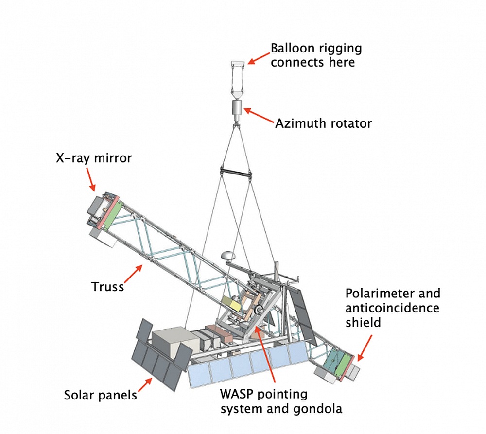 The XL-Calibur mission incorporates a 12 meter long truss equipped with an X-ray mirror at one end and a scattering polarimeter at the other end. The truss assembly is mounted in a custom gondola, which incorporates a pointing system known as WASP (Wallops Arc Second Pointer). The gondola is suspended beneath a modified NASA rotator, which provides large-angle azimuth targeting and coarse azimuth stabilisation. The WASP system points the truss using a pitch/yaw articulated gimbal mounted on the gondola. Sub-arcsecond pointing is enabled by the mechanical design of the gimbal hubs, where high-precision angular contact bearings float the rotor-side and stator-side of the hub on a central shaft. To orient the gondola, XL-Calibur uses two star cameras. One star camera is co-aligned with the X-ray mirror, and the other is oriented 25º from the pointing axis. The second star camera enables pointing at elevations exceeding 65º (through the balloon), and pointing at targets in the presence of stratospheric clouds along the line-of-sight.