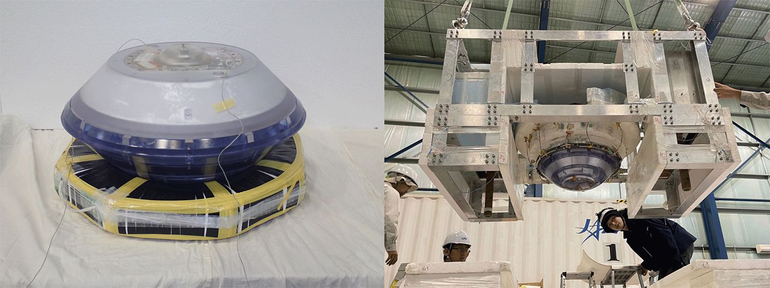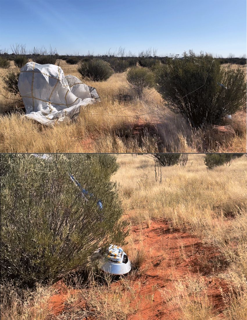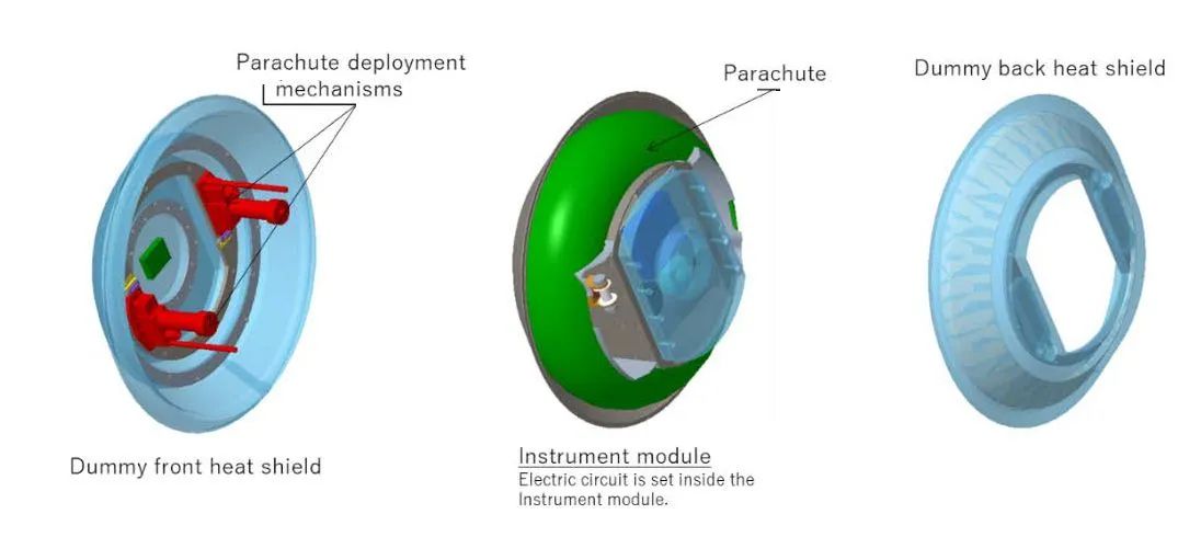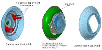 The SRC was meant to be released from a stratospheric balloon at an altitude of between 39 and 40 kilometers. It will be in free-fall till it reaches 16 km of altitude when it will separate into three bodies as we can see in the scheme at left. The main instrument, weighing 24kg will then come down to earth on a parachute. The two heat shields, weighing 18kg and 5kg respectively, will continue in free-fall to earth. All the operations will be conducted under management and supervision of the Civil Aviation Safety Authority of Australia.