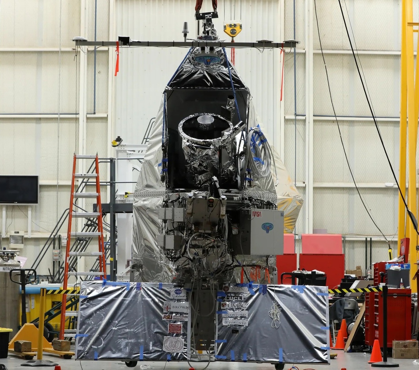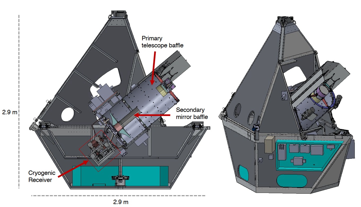 The cryogenic system includes a dewar and two Thales pulse tube cryocoolers to maintain the required low temperatures for the spectrometer and detector. The coolers dissipate heat through a copper-methanol thermosyphon system, connected to radiators that expel heat to space. This configuration enables a more compact and lighter design, which simplifies operations for the balloon flight. Vibrations from the cryocoolers are minimized to ensure that pointing stability remains unaffected.