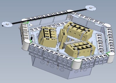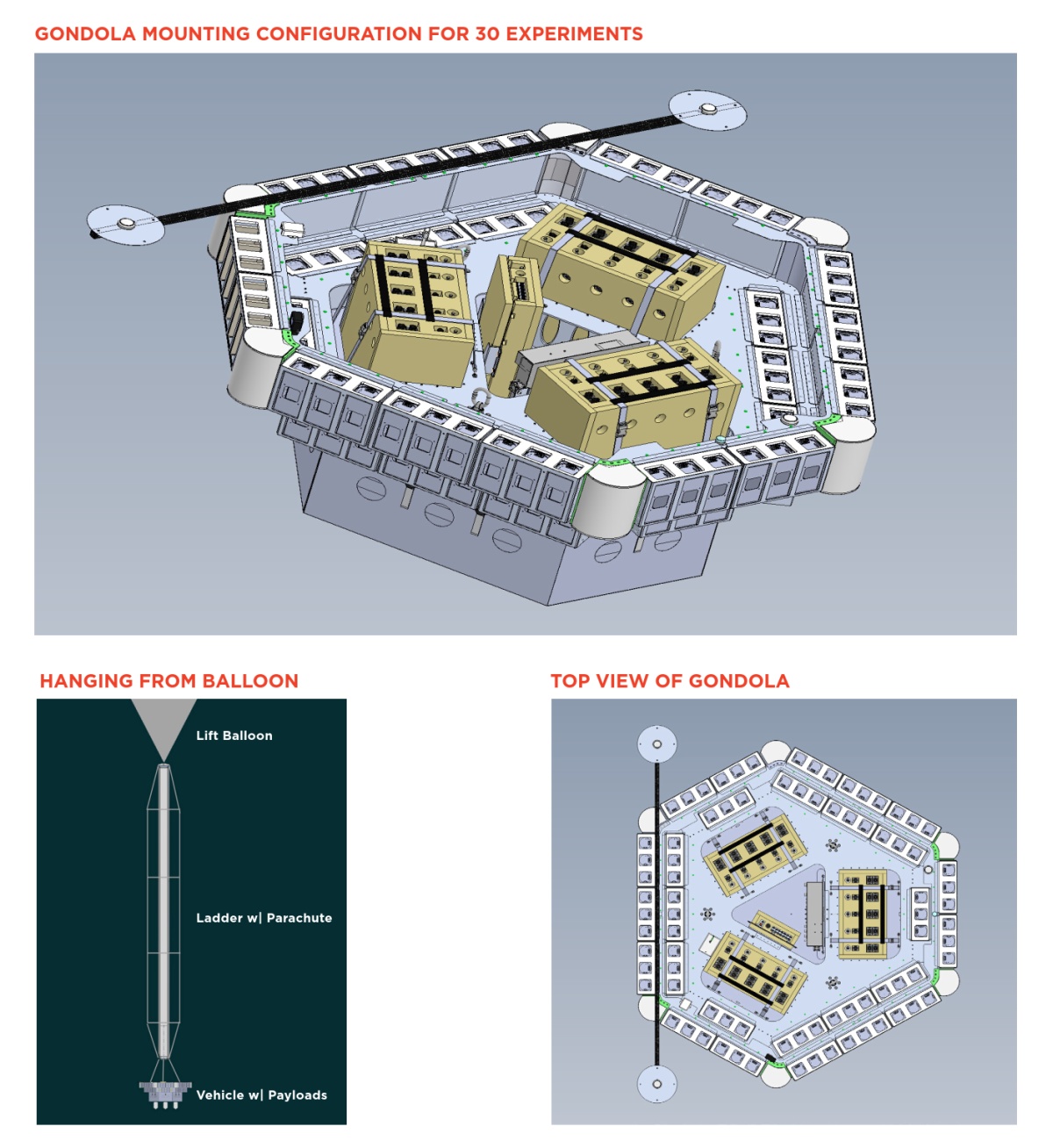 In the image at left we can see a basic scheme of the gondola that hosted the student experiments (click for more details). The gondola, developed specially for the program by World View was capable to accomodate up to 30 experiments. After selected, each team receives a Flight Box with a size of 10 x 10 x 20 centimeters that they must use to install the experiment to be flown which can't exceed 1 kilogram of weight. Power for each experiment is provided by an onboard power source (9 volts and 1.5 ampers) and data communication is based on a serial interface. No Bluetooth, Wi-Fi, cellular phones, or RF communications are allowed as they can interfere with the balloon onboard systems or could affect nearby experiments.