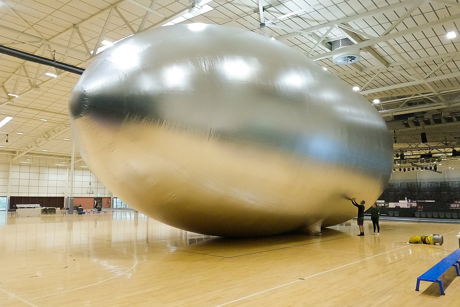 In the image at left we can see the only known image of the fully-inflated airship during an indoor test.