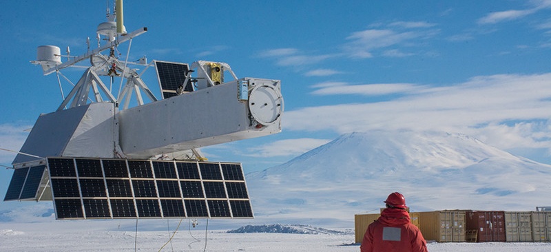 The experiment, denominated GRIPS (Gamma-Ray Imager/Polarimeter for Solar flares) was born by a collaboration that includes the aforementioned SSL along with NASA's Goddard Space Flight Center; The Lawrence Berkeley National Laboratory; the University of California, Santa Cruz and the Nagoya University from Japan. Below these lines we can see an image of the instrument with a magnificent view in the background of Erebus mount.