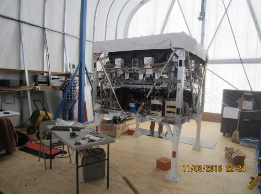 At right we can see an image of BACCUS during the integration process at LDB camp in McMurdo. The scientific team is working on a tent structure made on a metal frame with an insulated covering slightly rounded on top, installed close to the two high bay payload assembly buildings that form the core of the facility and which every summer are towed to its place after being stored on snow berms during the rest of the year.
