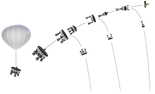 Bloostar, is a launch vehicle based on a hybrid system called "Rockoon" (contraction of the English terms "Rocket" and "Balloon") on which the first stage of the ascent is carried out using a stratospheric balloon that transports the vehicle up to 30 km. Once there the rocket ignites and detaches itself from the balloon to insert the payload into orbit. The thrust is given by a set of liquid fuel engines grouped as concentric reusable toroids attached to the central payload. Each toroid acts as a stage during the rise of the rocket, separating progressively from the vehicle and then being recovered on Earth, similar to what happens with a conventional satellite launch, as we can see in the scheme below.