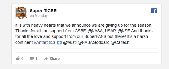 The communication of the end of the campaign was made a day after the last launch attempt by the scientists from Washington University in St. Louis which were in charge of the operation of the SuperTIGER instrument. In a later communication they informed that instead returning to the United States, the payload will be put in special storage at McMurdo Station to survive the Antarctic winter to be hopefully launched next summer.