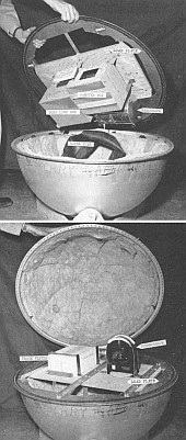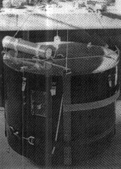 It consisted of an insulated fiberboard "hatbox", 32 inches in diameter and 24 inches high, opening in clamshell fashion about the vertical centerline to distribute the agent packages. Five agent containers holding approximately 16,5 pounds of carrier plus 1,75 pounds of agent were grouped around a chemical-type heater designed to maintain the proper agent environment. A neutralization system was included to render the agent innocuous in case of malfunctioning of the balloon delivery system. A combination barometric and mechanical timer fuze provided the control for the neutralizing system, flight termination, munition drop and agent dissemination.