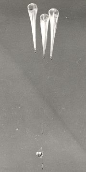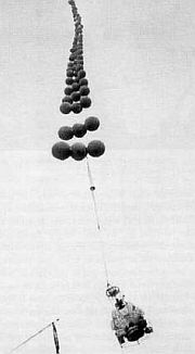 The balloons were connected to the fifteen foot long projectile by a tether system and included an inverted parachute to slow the ascent.