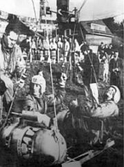 The system lifted Dollfus from Villacoublay, France, shortly after sunset. Consisting of 105 balloons attached to the 1.500 foot line in clusters of three at a separation distance sufficient to accommodate their final diameter of about 30 feet. The lightweight gondola, a 230-pound sphere of thin metal about six feet in diameter, was sealed, pressurized, and air-conditioned.