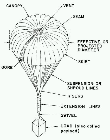 The figure at left schematically illustrates a descending parachute with attached load. Most features of parachutes used in scientific ballooning are shown, thought variations may be found. A parachute with its payload and ancilliary equipment will be termed a parachute system.