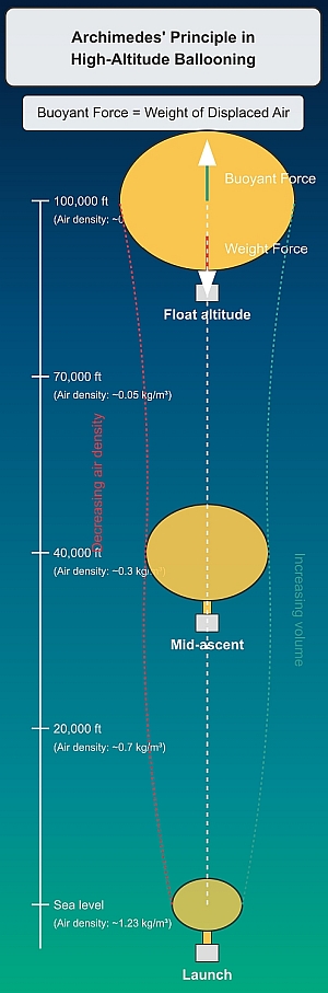 Archimedes' principle applies directly to high-altitude ballooning through the relationship between buoyant force and displaced air. The diagram at left illustrates how this principle operates across different altitudes during a balloon's ascent.