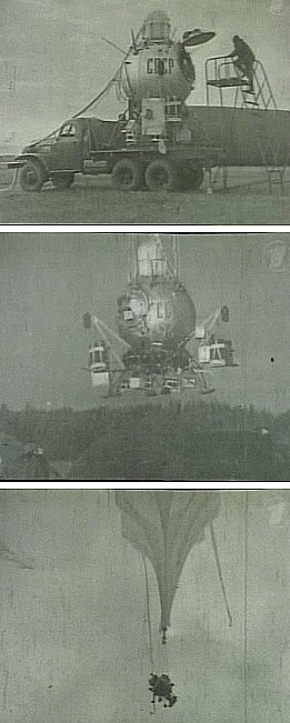 There is no much information available on the subject but apparently in 1958, under the direction of Gennadiy F. Chekalin, where built the firsts gondolas of the program, and the next year started the first unmanned flight tests. The capsule was basically a sphere mounted over a circular platform with eight legs, that counted with two small compartiments one for the commander and the other for the pilot. Almost 5 or 6 capsules were built (some sources say they were as many as ten) for use in ground test, manned and unmanned flights.