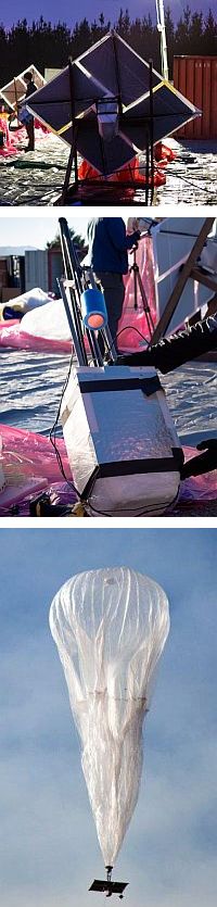 Beneath each balloon is attached a small box containing circuit boards that control the system, radio antennas to communicate with other balloons and with Internet antennas on the ground, and batteries wich are powered by an array of flexible solar panels that sits between the envelope and the box. In full sun, these panels produce 100 Watts of power - enough to keep the unit running while also charging a battery for use at night. A parachute attached to the top of the balloon envelope allows for a controlled descent and landing whenever a balloon is taken out of service.