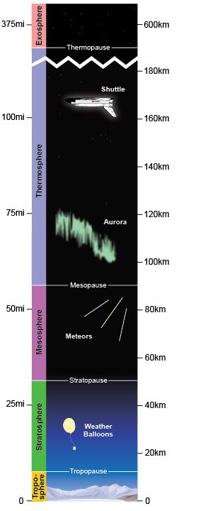 Located between about 53 miles (85 km) and 375 miles (600 km), this layer is known as the upper atmosphere.