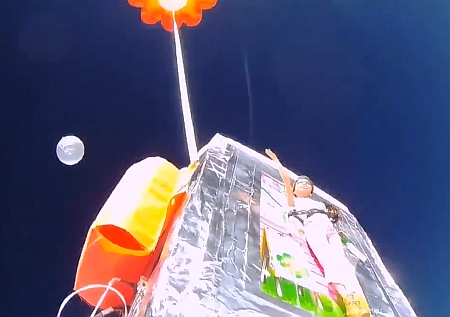 A Barbie attached to the balloon gondola plunging to earth from the stratosphere. Far behind is the balloon (Image: Raven Aerostar)