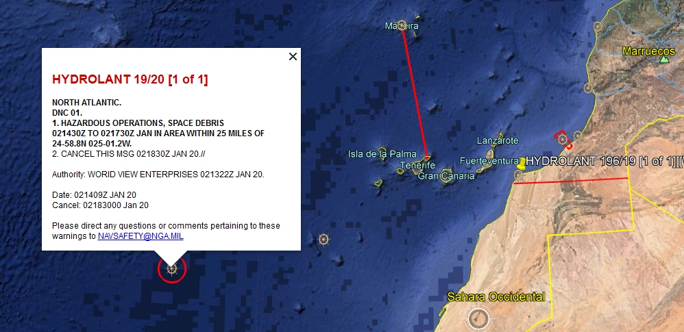 The search would pay off on January 2, when I've finally found notice of the landing... Or rather the sinking. Hydrolant 19-20, a maritime bulletin issued that day showed a warning of hazardous operations related to "space debris" in the north Atlantic valid between 14:30 and 17:30 utc in a radius within 25 miles of coordinates 24-58.8N 025-01.2W. The notice made no mention of any balloon but Bingo ! it had been issued by World View Enterprises. Below these lines there is a map showing the aforementioned area and message.
