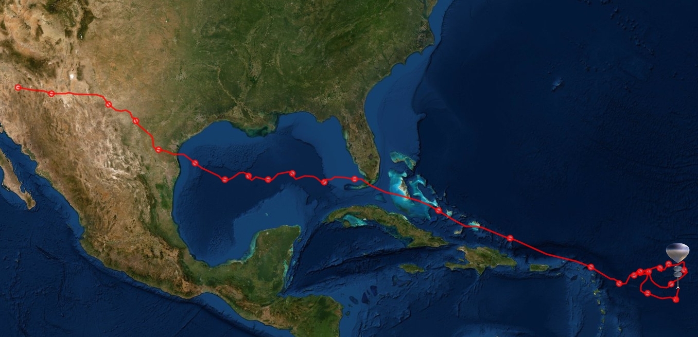 As you may remember from the last edition of TSR, the Tucson-based balloon firm performed the launch of one of their long duration balloons on December 16th which swiftly moved across Mexico and the United States. Just over a week later the craft was wandering east of the Lesser Antilles in the Caribbean, circling endlessly. The map below shows the flight path and last position of the balloon as of December 28th, 2019.
